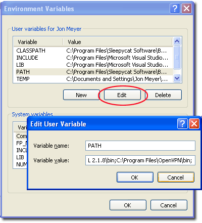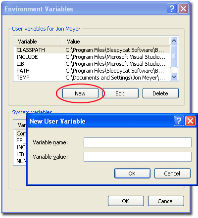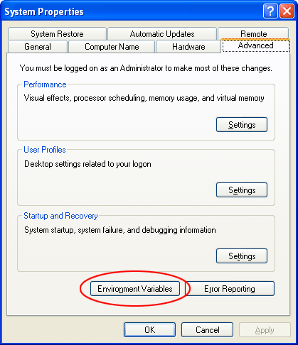 1. Open the control panel, double click on System, click on the Advanced tab of the System Properties, and click on the Environment Variables button: