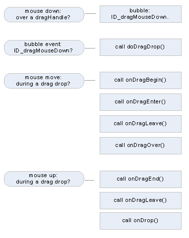 Drag drop initiates when the user presses the mouse down on the page. A global mouse event handler listens for these events and responds as follows: