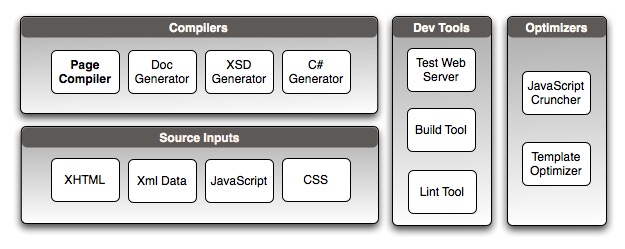 The heart of the Jitsu Compiler is the Page Compiler, which turns XHTML and Xml markup into a JavaScript. It defines: