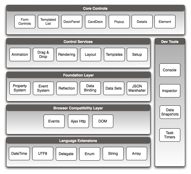 - Foundation classes that define a property and event system, and DataSet and DataObject classes.