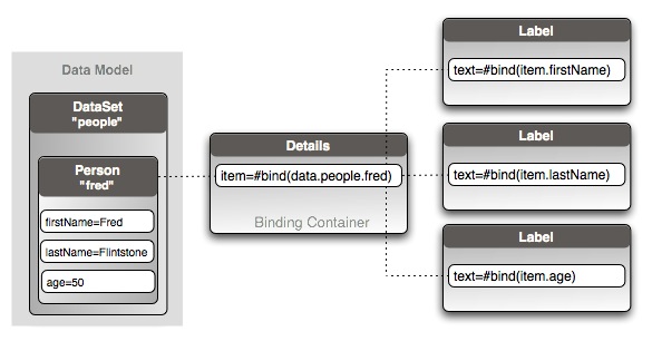 This illustrates another important point about binding: You can have chained bindings. The Label binds to the Details control, which in turn binds to the Person in the "people" dataset. When changes occur, they propagate all the way up the binding chains.