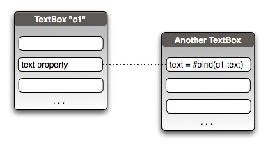 Binding is two-way . When the text property in the TextBox called "c1" changes, the framework checks to see if any other controls have properties bound to c1's text property. It finds the Label and the second TextBox, so it propagates changes to the bound properties in those controls.